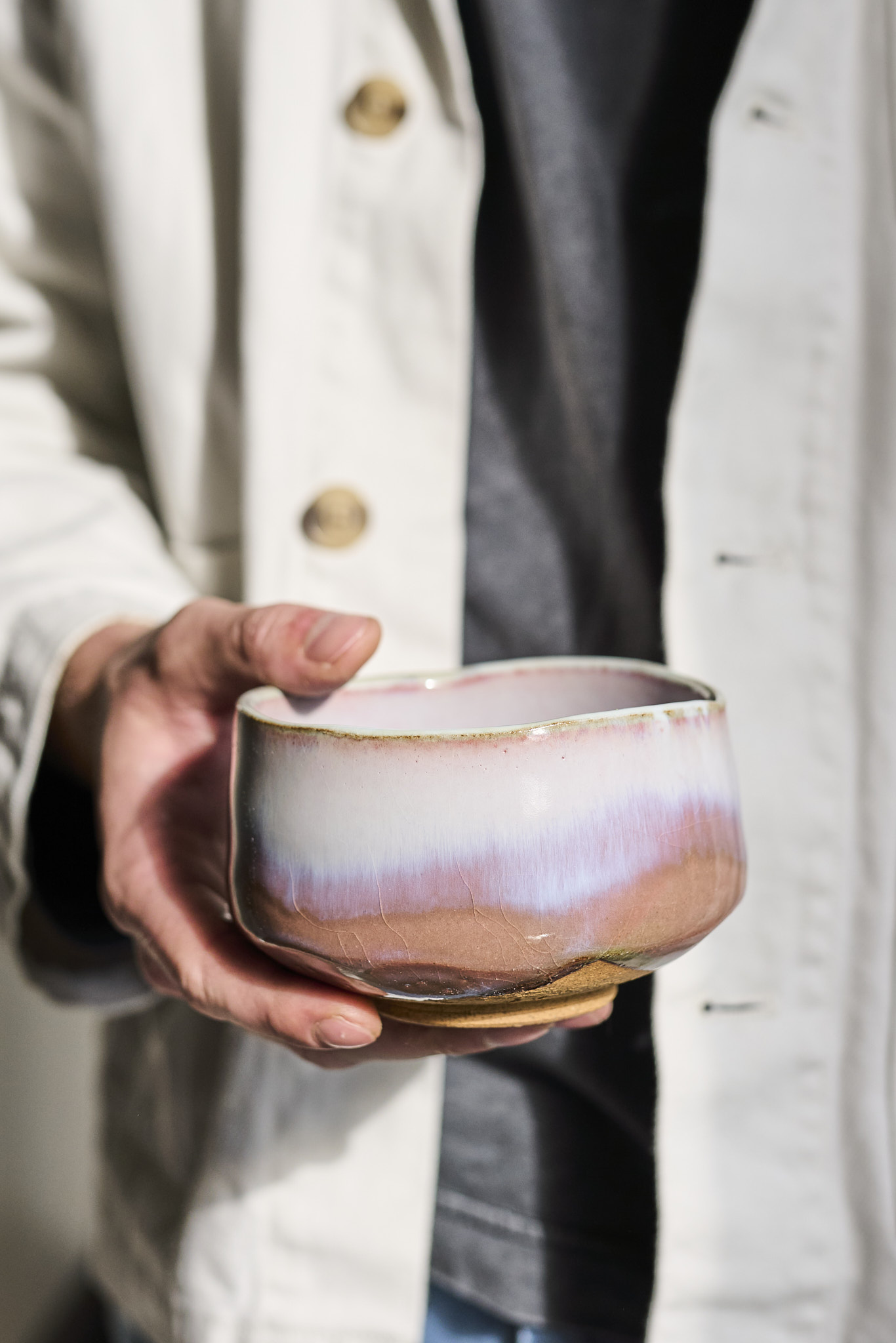 Matchawan Kinbo to unikalne naczynie do picia matchy o nieregularnych brzegach i przenikających się nawzajem kolorach. Wyłaniający się z brązu zimny błękit przypomina mgłę lub nieziemski pył.