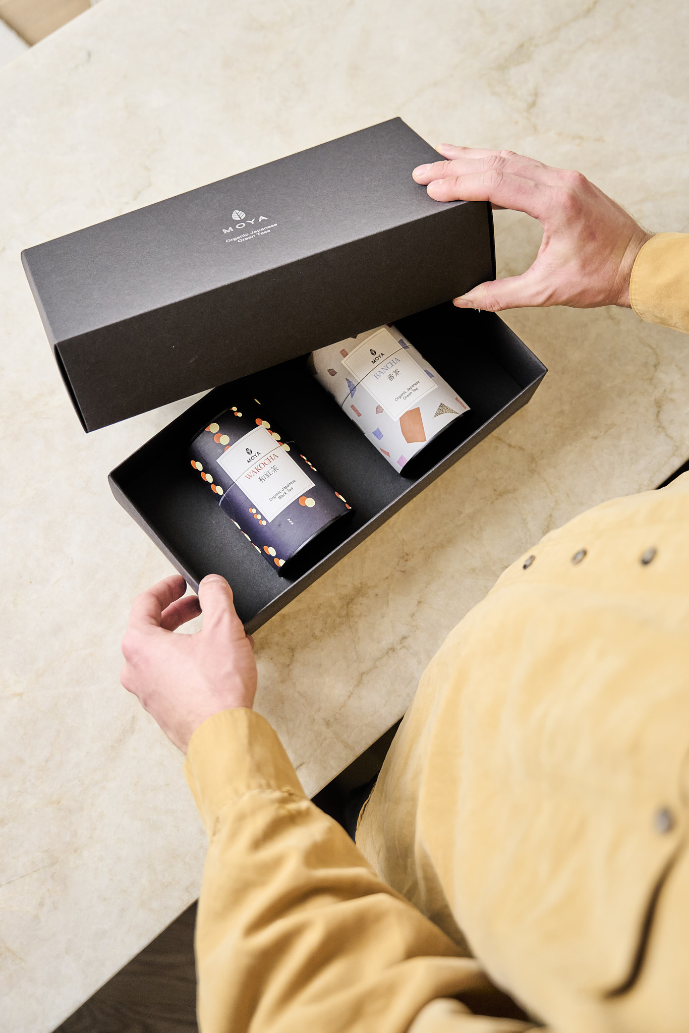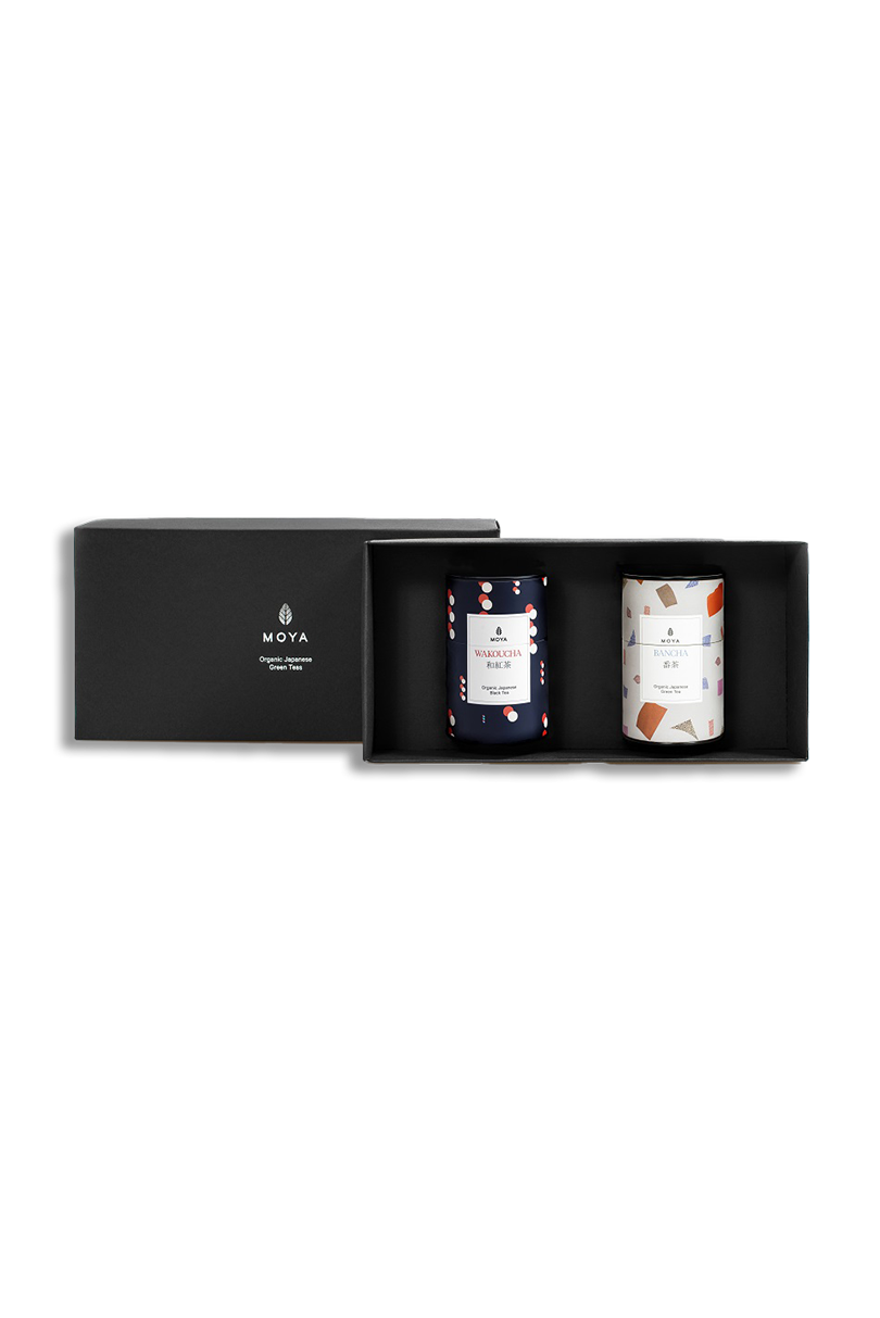 Moya organic Wakocha & Bancha set in an elegant black paper box