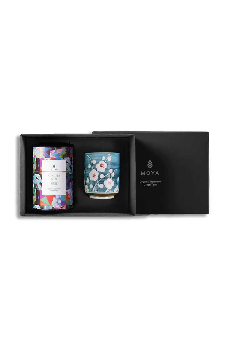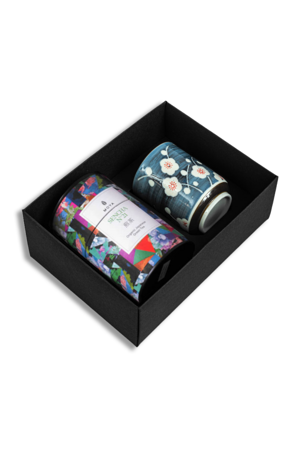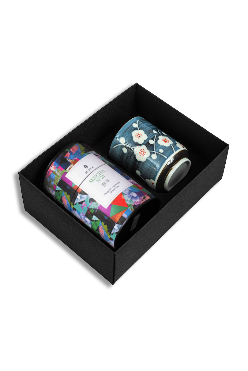 Zestaw zawiera dwa kubki Josei i wybraną herbatę liściastą Moya.