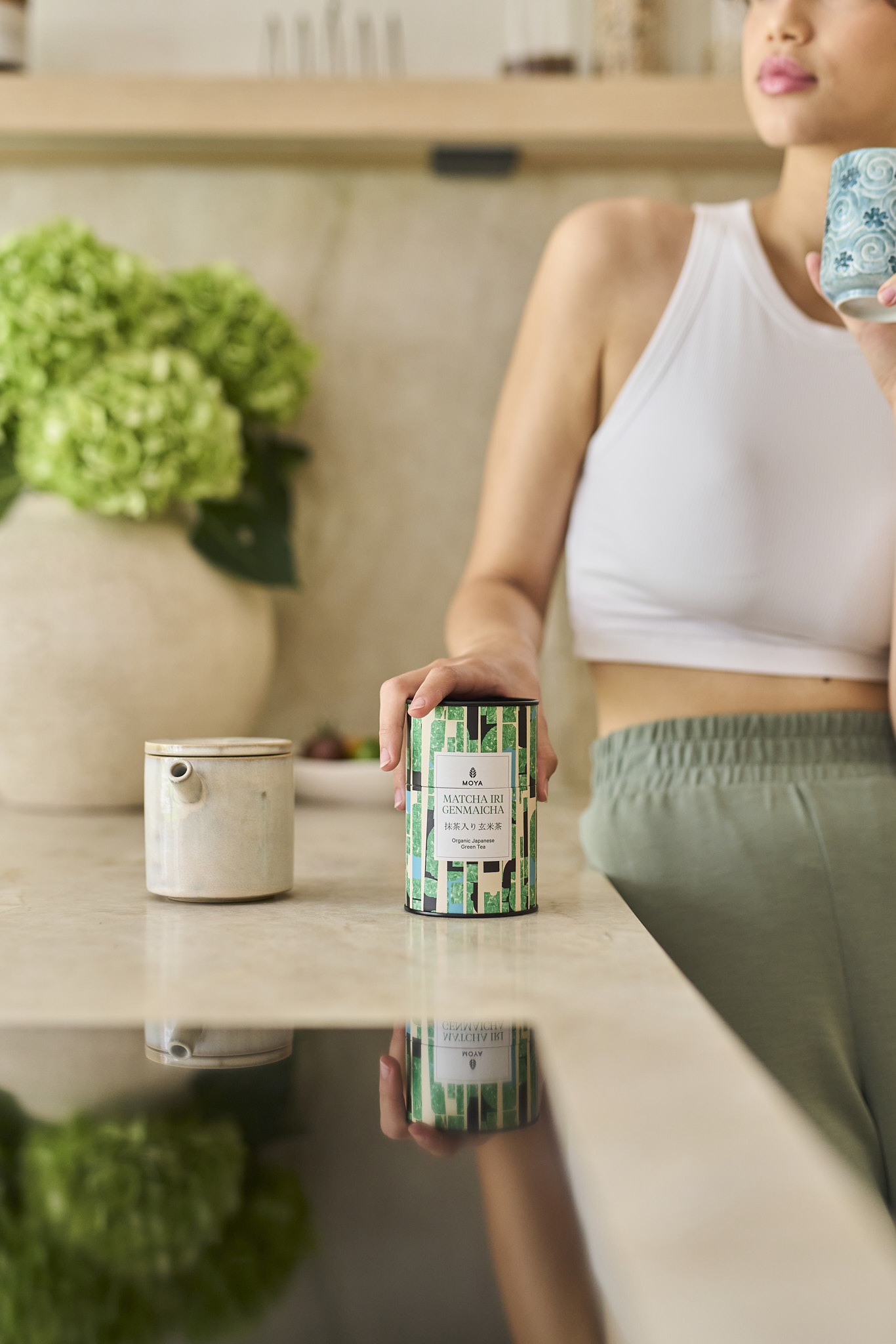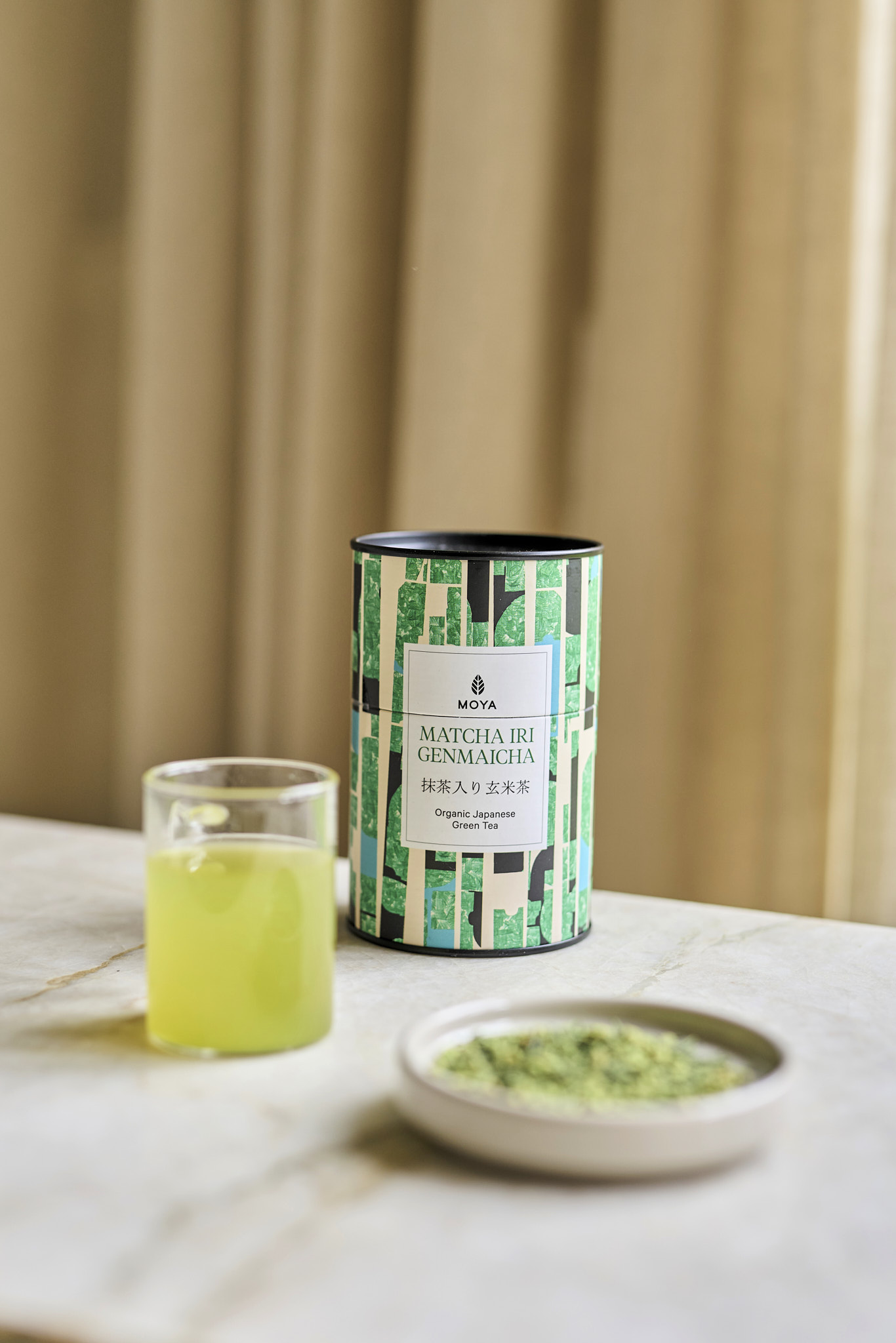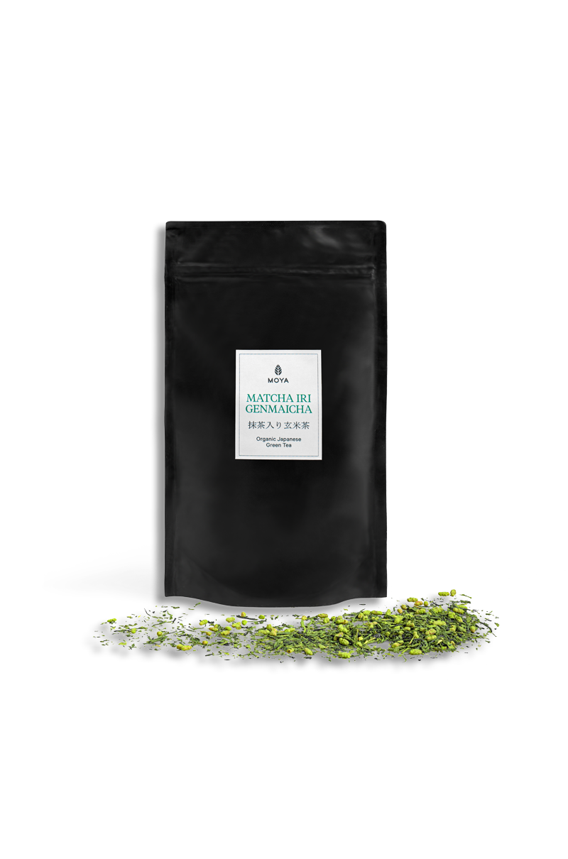 Moya Matcha Iri Genmaicha to nowa odsłona bestsellerowej genmaichy, czyli zielonej herbaty z ryżem. Składa się z delikatnych suszonych liści senchy, drobno zmielonej certyfikowanej matchy oraz ziarenek organicznego prażonego brązowego ryżu zwanego w Japonii „genmai”. Jej smak jest delikatny, świeży, słodko-maślany, uzupełniony morskimi nutami umami, za które odpowiada oczywiście matcha.