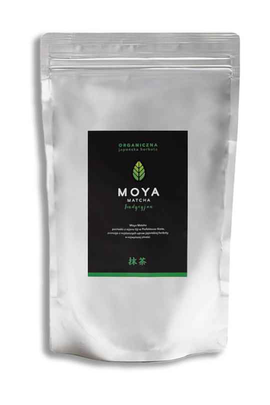 Moya Matcha Tradycyjna posiada intensywnie zieloną barwą, dobrze zbalansowany gorzko-słodki smak i delikatny herbaciany posmak. Idealnie pasuje do picia w tradycyjnej formie, jak również do przyrządzania matcha latte, smoothie i koktajli. Pozyskuje się ją z wyłącznie pierwszego i drugiego zbioru świeżych liści krzewów, które dojrzewają pod specjalnymi przeciwsłonecznymi osłonami. Dzięki temu zabiegowi liście uzyskują wyższą zawartość chlorofilu i l-teaniny oraz nabierają intensywnego zielonego koloru. Zaraz po zebraniu, liście są delikatnie parowane, suszone i ścierane na drobny proszek po oddzieleniu liści od łodyg. Cały proces produkcji matchy w Uji jest niezwykle czasochłonny a każda partia liści jest starannie sprawdzana. Więcej o procesie produkcji matchy przeczytasz tutaj. Przez swoją uniwersalność, Moya Matcha Tradycyjna jest najchętniej wybieraną matchą przez osoby, które dopiero zaczynają przygodę z tą herbatą.